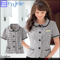 細かいチェックとちりばめられたかわいいモチーフとトレンドの小さな襟が上品で軽やかな印象を与えます。清楚で正統派のデザインが広く愛される一着です。