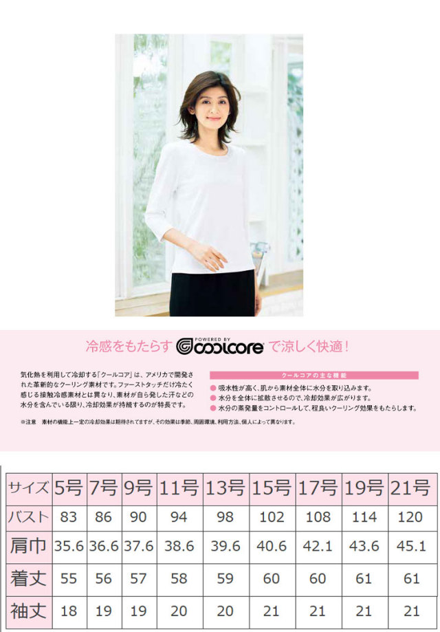 冷感をもたらすクールコア素材で涼しく快適。気化熱を利用して冷却する「クールコア」は、アメリカで開発された革新的なクーリング素材です。ファーストタッチだけ冷たく感じる接触冷感素材とは異なり、素材が自ら発した汗などの水分を含んでいる限り、冷却効果が持続するのが特長です。