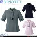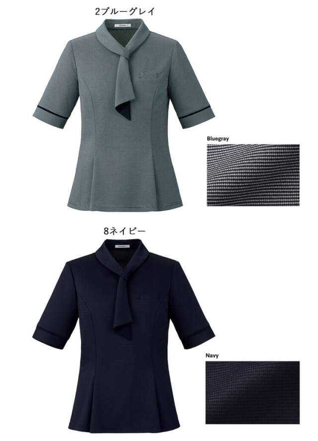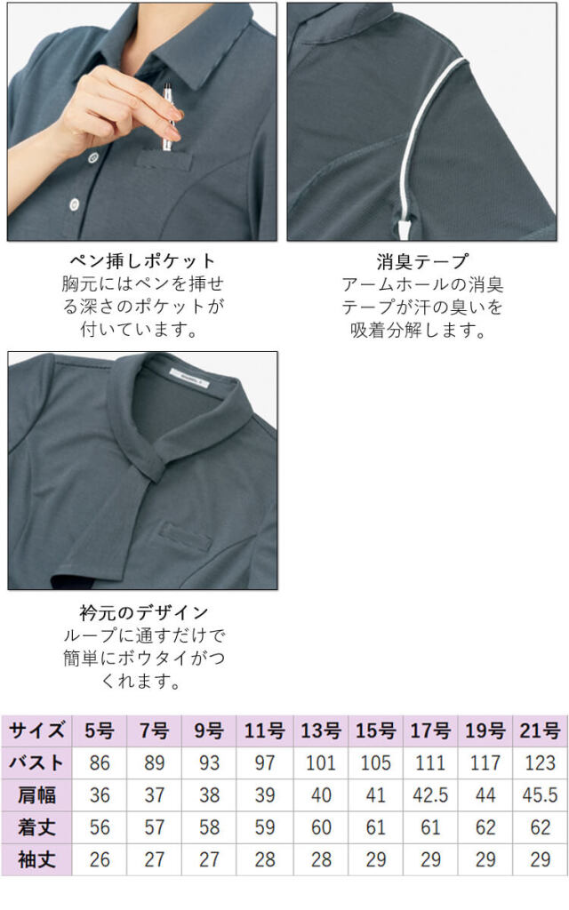 エレガントな雰囲気を醸すボウタイは、ループに通すだけで決まる簡単設計。首元は着脱しやすいようボタンで開け閉めでき、華やかな見た目とユニフォームとしての機能性を両立。ウエストをさりげなくシェイプしながら、裾に向けて上品に広がるAライン。切替えを入れて美シルエットをキープしつつ、裾のフレアが気になるお腹周りをカバー。袖丈を通常より長めの27cm(9号)にリサイズ。半袖ならではの涼しさや動きやすさはそのままに、二の腕をすっぽりカバーしてくれるので、安心感たっぷりです。吸湿性・放湿性に優れた再生繊維キュプラを複合した高機能なエコ素材「モイステックスクール」を使用。湿度をコントロールして暑い夏でもべたつかず、肌心地のよさを叶えます。