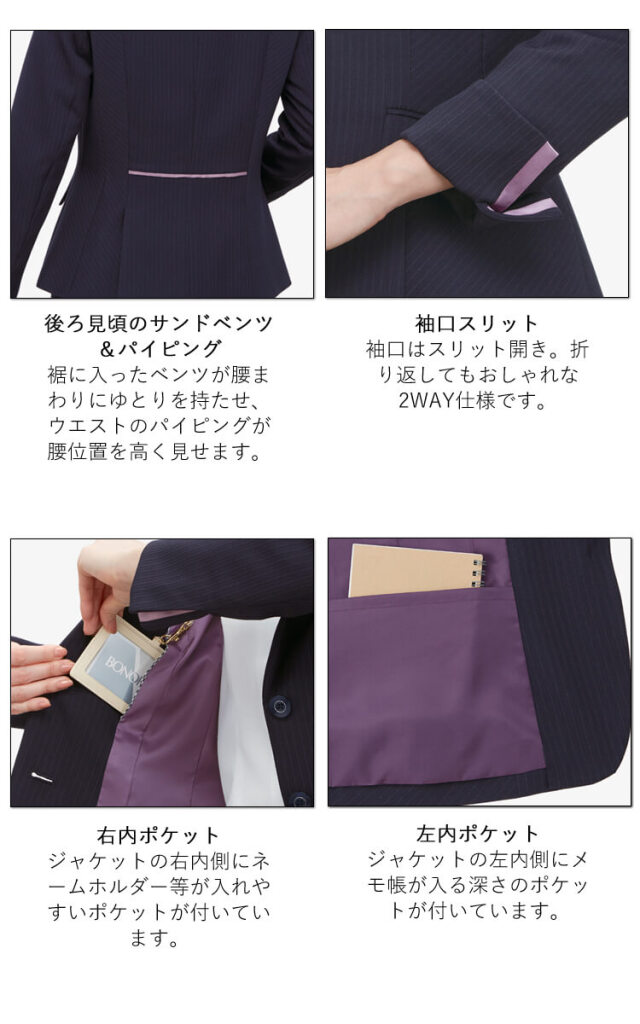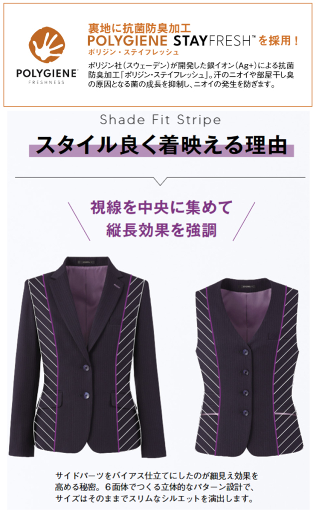 縦長効果を後押しする細いピッチのストライプ柄で、着ヤセが叶う「シェイドフィットストライプ」。ディテールにカラーアクセントを加えて、女性らしさをプラスしながら、クールでスマートな着こなしを実現しました。裏地に抗菌防臭加工「ポリジン・バイオスタティック」を採用しています。ポリジン社(スウェーデン)が開発した銀イオン(Ag+)による抗菌防臭加工「ポリジン・バイオスタティック」。汗のニオイや部屋干し臭の原因となる菌の成長を抑制し、ニオイの発生を防ぎます。有効成分である塩化銀は環境にもやさしく無香料なので、周りの人にも安心&安全です。角度によって表情が変わる繊細なストライプをアレンジしてクールな印象に。適度なふくらみのあるウールライクな素材で立体的なシルエットをつくります。しなやかな風合いとストレッチで着心地も快適です。