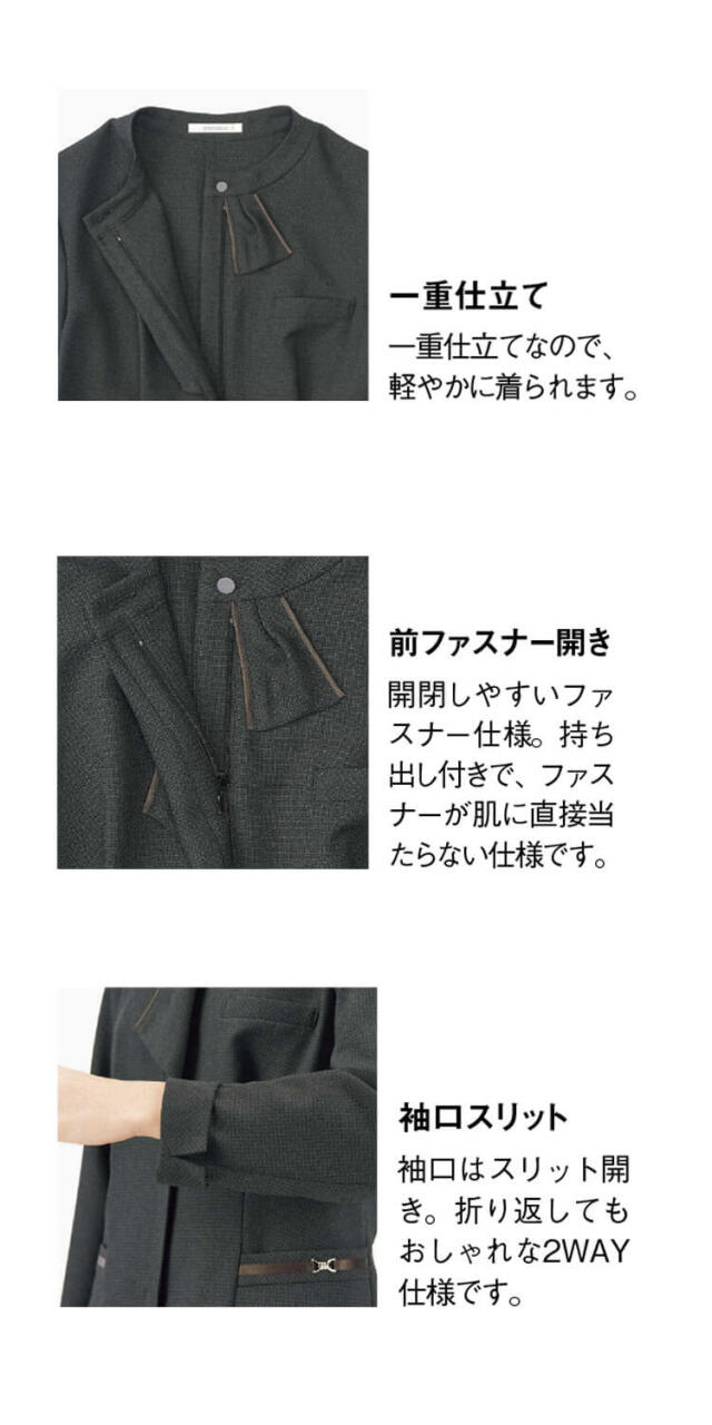 ノーブルドビー素材を使用したオールシーズン対応の軽くて動きやすい事務用ソフトジャケットで、前ファスナー仕様と一重仕立てが特徴のアイテムです。前開きは前ファスナー開きで、着脱しやすい仕様になっています一重仕立てで裏地を抑えた軽めの作りのため、長時間の着用でも軽やかな着心地を意識したデザインです。袖口スリットがあり、腕まわりの動きやすさと手首まわりの抜け感を出せる仕様になっています。
