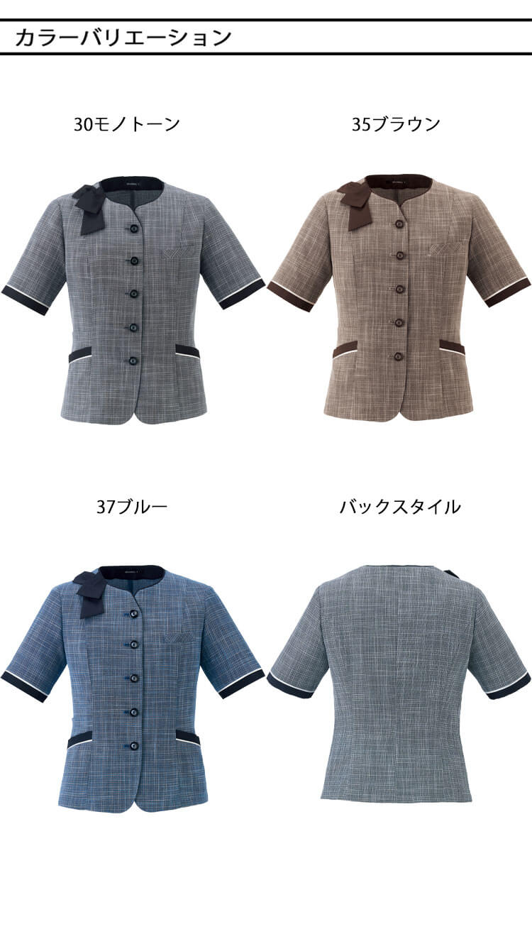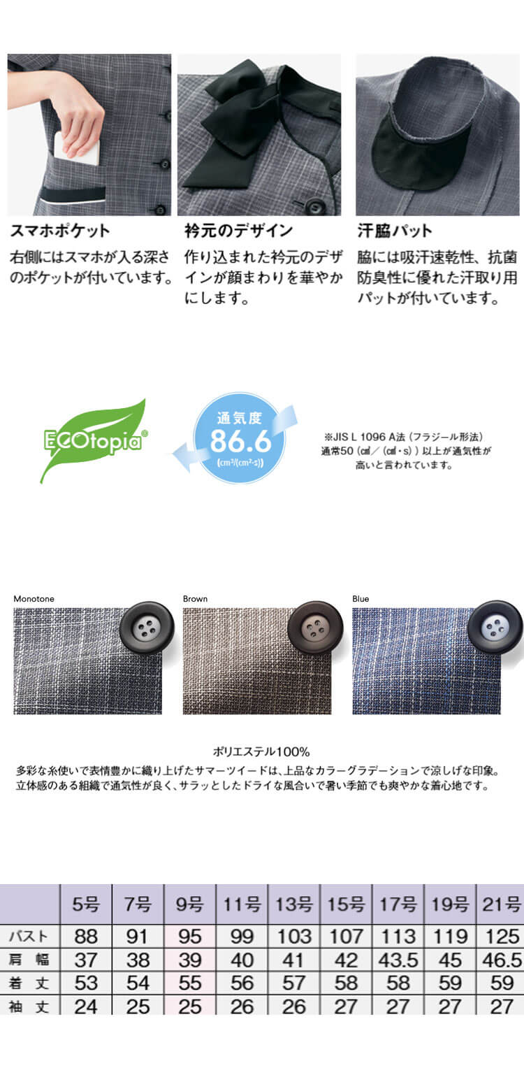 多彩な糸使いで表情豊かに織り上げたサマーツイードは、日本製ならではのこだわり素材で高級感たっぷり。エレガントなデザインとカラーで、ワークシーンがぱっと華やぐような、優しく品格のあるスタイルを演出します。