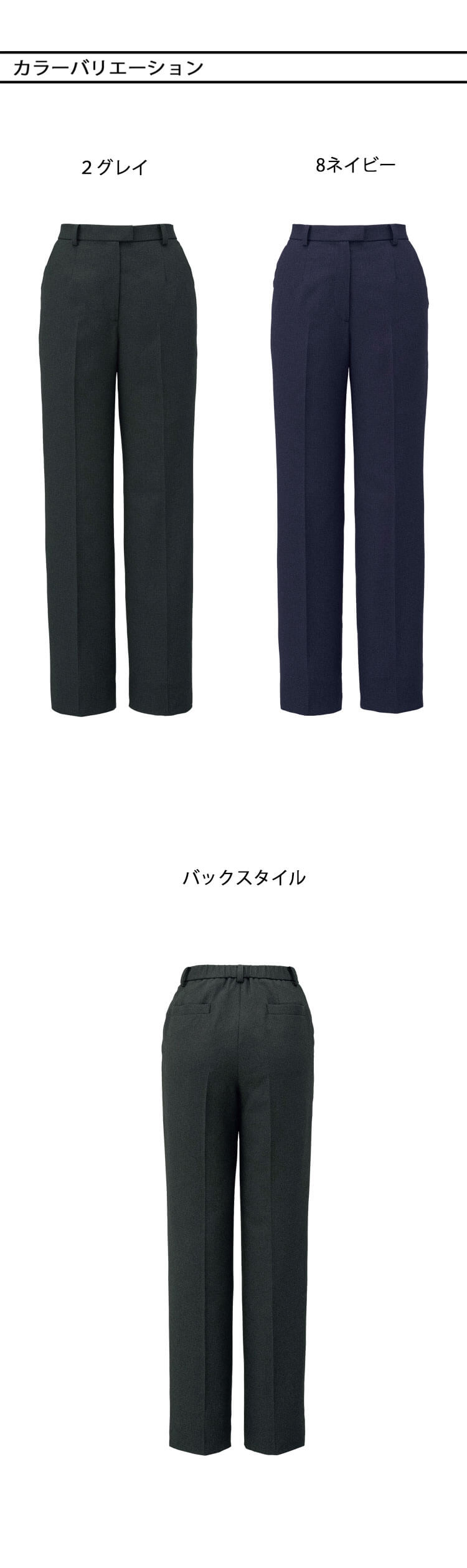 ノーブルドビー素材を使ったオールシーズン対応の事務用テーパードパンツで、裾上げがしやすいのが特徴です。ヒップから裾にかけてすっきり見える細身シルエットで、ジャケットやベストと合わせてもきちんと感が出ます。ウエストゴム入りでフィット感がよく、斜めポケット付きで実用性も考慮されたデザインです。