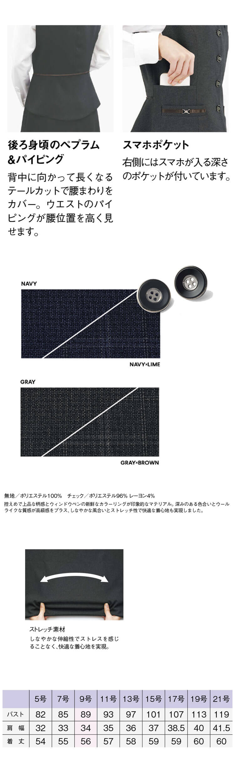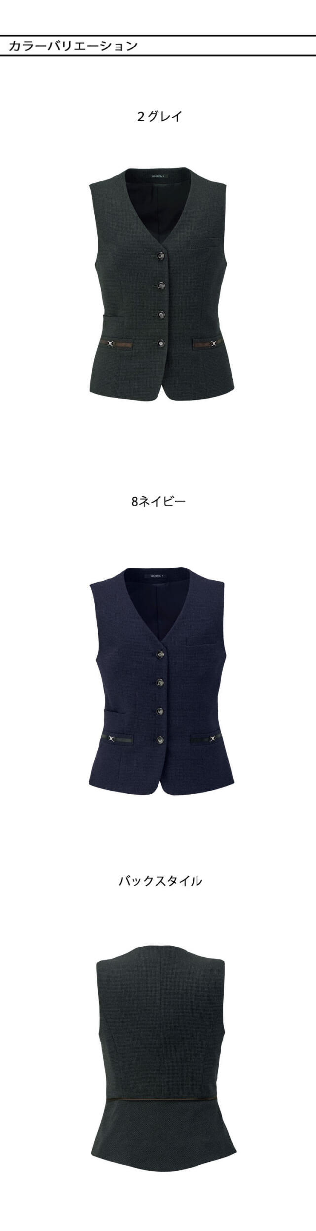 オールシーズン快適に着られる、上品なノーブルトラッドシリーズの事務服ベストです。 シンプルなデザインながら、ペプラム&パイピングなどのディテールで、女性らしいメリハリのあるシルエットに仕上げています。生地アップ・ボタン・ペプラム&パイピング・バックスタイルなど、細部までこだわったデザインで、どの角度から見ても美しい印象を演出します。ストレッチ素材とスマホポケット付きで、デスクワークから来客対応まで、動きやすさと実用性をしっかり確保しています。シーズンはオールシーズン対応で、春夏秋冬を通して着用できるため、年間の制服コーディネートがしやすいアイテムです。
