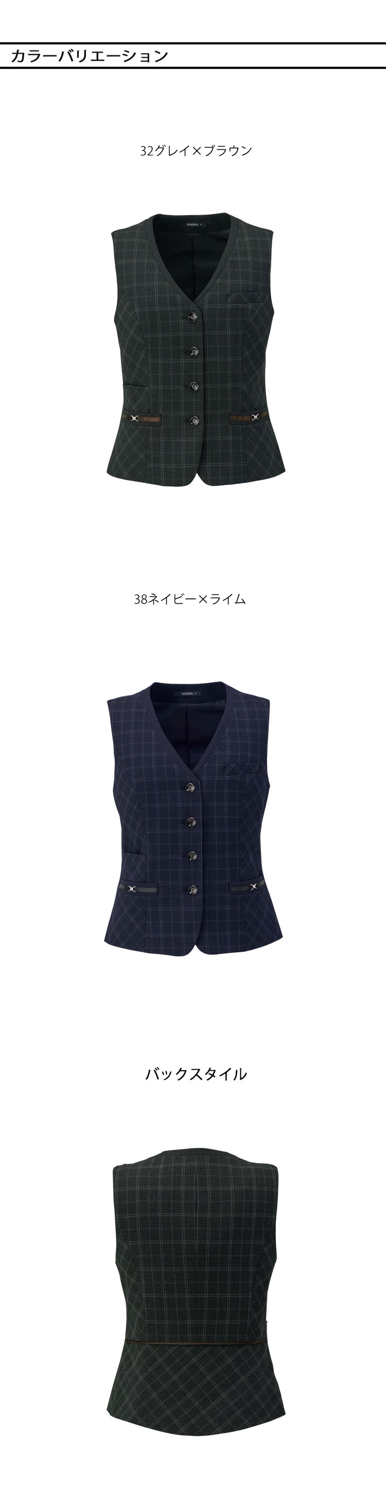 上質感・きちんと感・動きやすさを兼ね備えた、オールシーズン向けの高機能ベストです。 チェック柄のノーブルドビーCK素材と立体的なペプラムデザインで、事務服らしい信頼感と女性らしいシルエットを美しく演出します。前開きのベーシックなベストデザインに、ペプラム&パイピングでウエストラインをすっきり見せるシルエット設計です。生地アップやボタン、バックスタイルまでディテールにこだわり、どの角度から見ても上品で華美すぎない印象です。ノーブルドビーCK(ポリエステル・レーヨン混)の素材を使用し、なめらかな肌触りと程よいストレッチ性で長時間のデスクワークでも快適ですシワになりにくく、お手入れしやすい素材のため、毎日着用する事務服として扱いやすいのが特徴です。