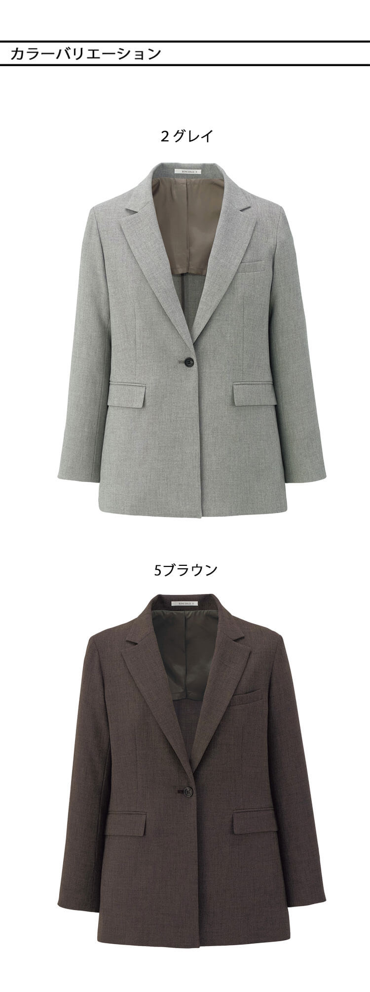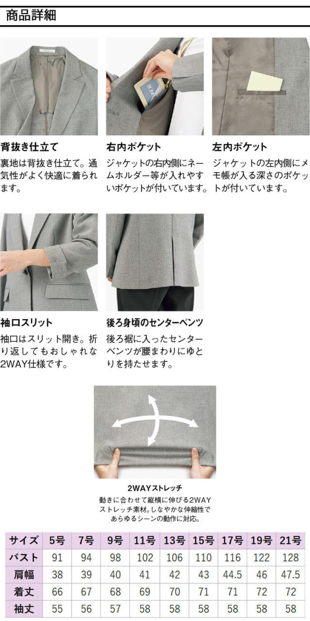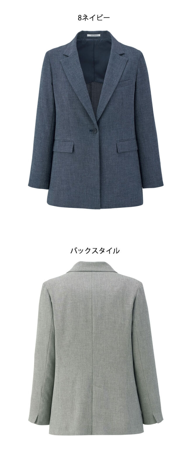 メランジドビー素材のオールシーズンジャケットで、2WAYストレッチと背抜き仕立てにより優れた動きやすさと美しいシルエットを両立します。ポリエステル100%の生地が軽やかで快適な着心地を提供し、事務シーンに最適です。生地はメランジドビー加工で高級感があり、2WAYストレッチで伸縮性抜群です。背抜き仕立てで軽量、袖口スリットとセンターベンツで動きやすく、両内ポケット(右・左)で実用性が高く、バックスタイルも洗練され、コーディネートしやすいです。