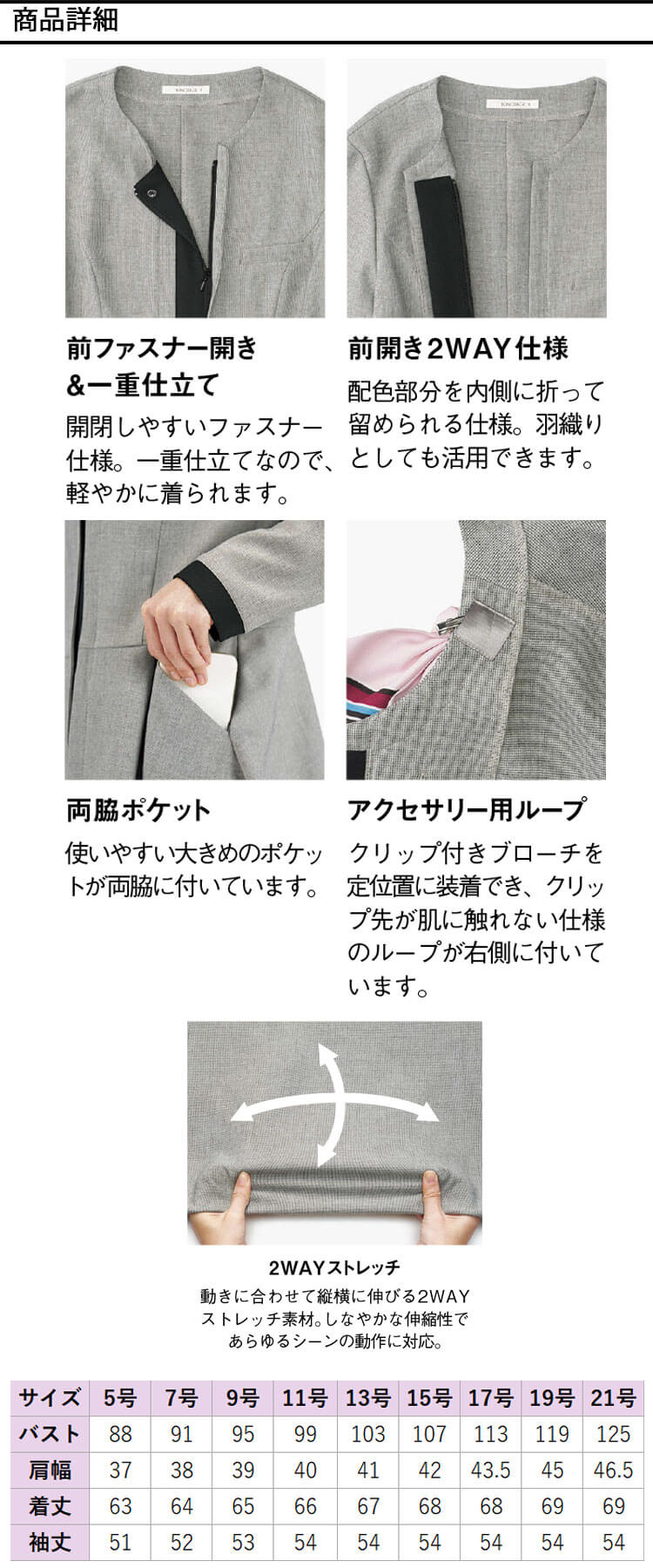 上品なメランジ調素材とやわらかな着心地が魅力のオールシーズン対応ジャケットです。ポリエステル100%のメランジドビーはシワになりにくく、オフィスワークでも美しいシルエットをキープします。一重仕立てで軽やかに羽織れ、長時間のデスクワークでも負担になりにくい設計です。動きにフィットする2WAYストレッチ素材で、腕まわりや前屈姿勢もスムーズに行えます。前ファスナー&前開き2WAY仕様で、着脱がしやすく忙しい朝の身支度もスピーディに整います。