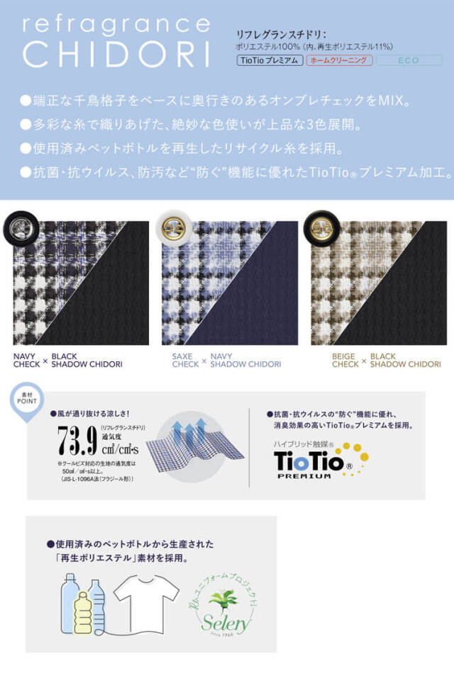 端正な千鳥格子をベースに奥行きのあるオンブレチェックをミックスしました。多彩な糸で織りあげた、絶妙な色使いが上品な3色展開です。使用済みペットボトルを再生したリサイクル糸を採用しました。抗菌・抗ウイルス・防汚など防ぐ機能に優れたTioTioプレミアム加工です。