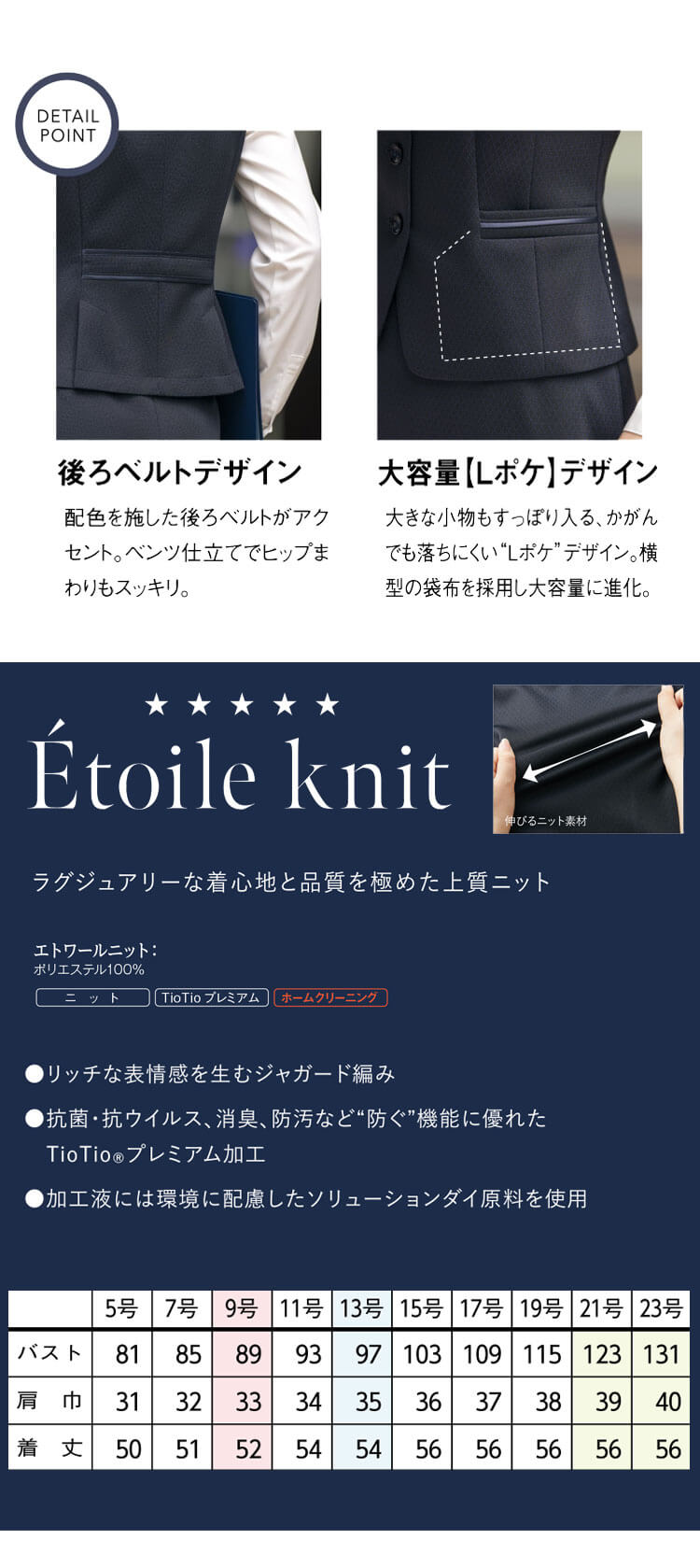 腰ポケットと背ベルトに施した配色がアクセントのベストです。 後ろベンツ仕立てでヒップ周りもスッキリです。上質を誇る、最高品質のニット「エトワールニット」シリーズです。立体感のあるジャガード編みが、ラグジュアリー感を際立たせ、リッチなムードが漂う着こなしです。ポリエステル糸は、染める際に水を50%以上カットするソリューションダイです。後加工には、“防ぐ”機能に優れたTioTioプレミアム加工です。空気中の酸素を利用して細菌の増殖を抑える抗菌・抗ウイルスや消臭に高い効果を発揮します。ついた汚れを落ちやすくする防汚機能もあり洗濯回数が減ることでエコにも繋がります。