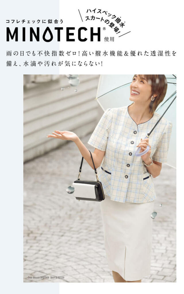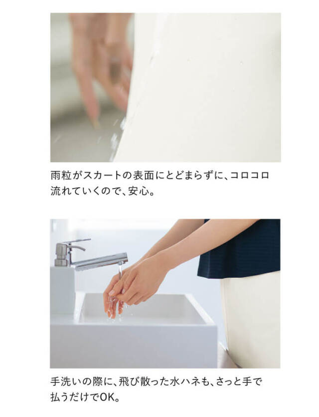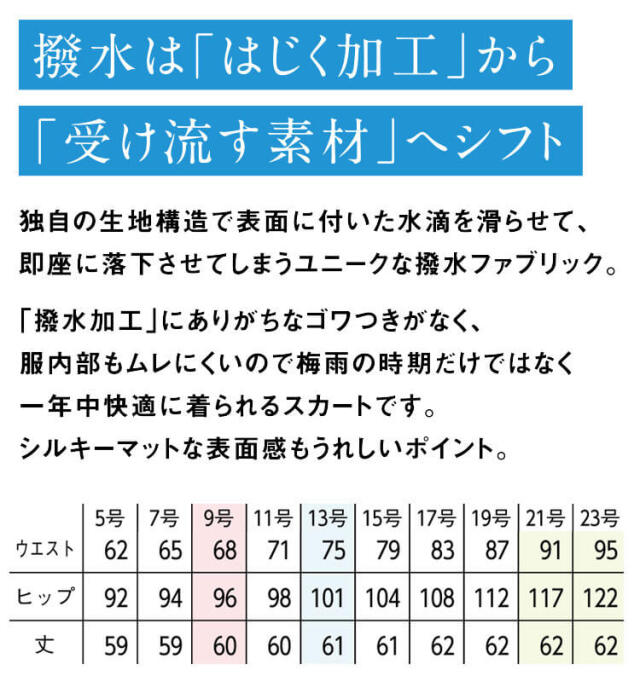 長めの丈感が大人レディな印象のタイトスカートです。撥水性のある機能素材で、水染み汚れの心配がないのも嬉しいポイントです。水をはじくのではなく、滑らせるという発想から生ま れた撥水素材「ミノテック(R)」凸状の生地表面「マイクロガーター構造」+特殊な撥水加工によって水滴を転がし、水をよけます。さらに、一般の撥水加工にありがちな蒸れも解消します。 ノンラミネート加工によって、汗・水分を衣服内部から外へ素早く放出し、衣服内のムレをおさえ快適に保ちます。