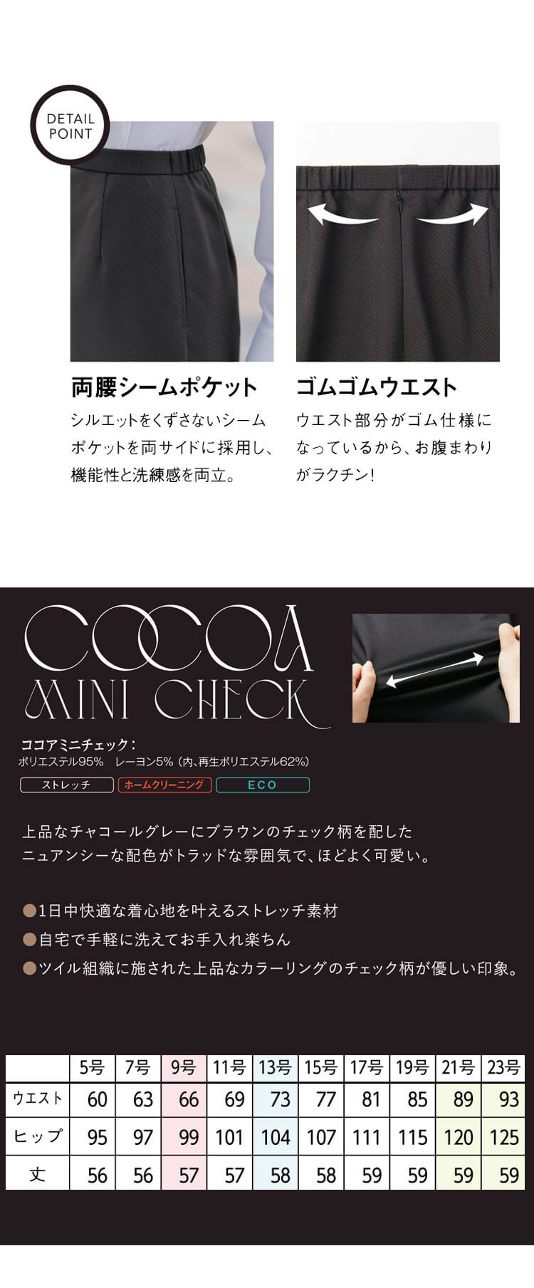 幅広い年齢層に人気の高いAラインスカートです。動きやすさとスッキリさを両立する後ろゴム仕様です。脇ポケットを左右両方に装着しています。ニュアンスカラーがやわらかな印象「ココアミニチェック」シリーズです。チャコールグレー×ブラウンの淡いチェック柄がどことなくフェミニンな印象です。大人トラッドスタイルは、幅広い職種や年齢層に愛されれるユニフォームの定番です。お求めやすい価格帯もポイントです。