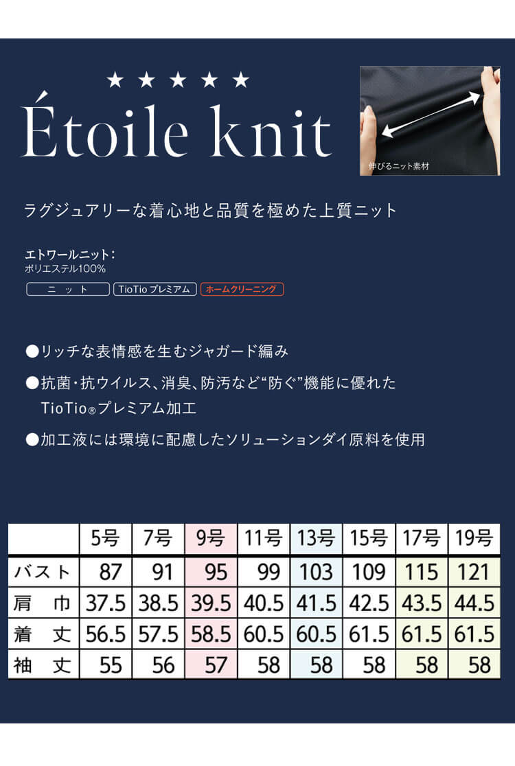 きちんと感のある2つ釦ジャケットです。腰ポケットの配色がアクセントです。 肩パットレスで肩への負担を軽減します。上質を誇る、最高品質のニット「エトワールニット」シリーズです。立体感のあるジャガード編みが、ラグジュアリー感を際立たせ、リッチなムードが漂う着こなしです。ポリエステル糸は、染める際に水を50%以上カットするソリューションダイです。後加工には、“防ぐ”機能に優れたTioTioプレミアム加工です。空気中の酸素を利用して細菌の増殖を抑える抗菌・抗ウイルスや消臭に高い効果を発揮します。ついた汚れを落ちやすくする防汚機能もあり洗濯回数が減ることでエコにも繋がります。