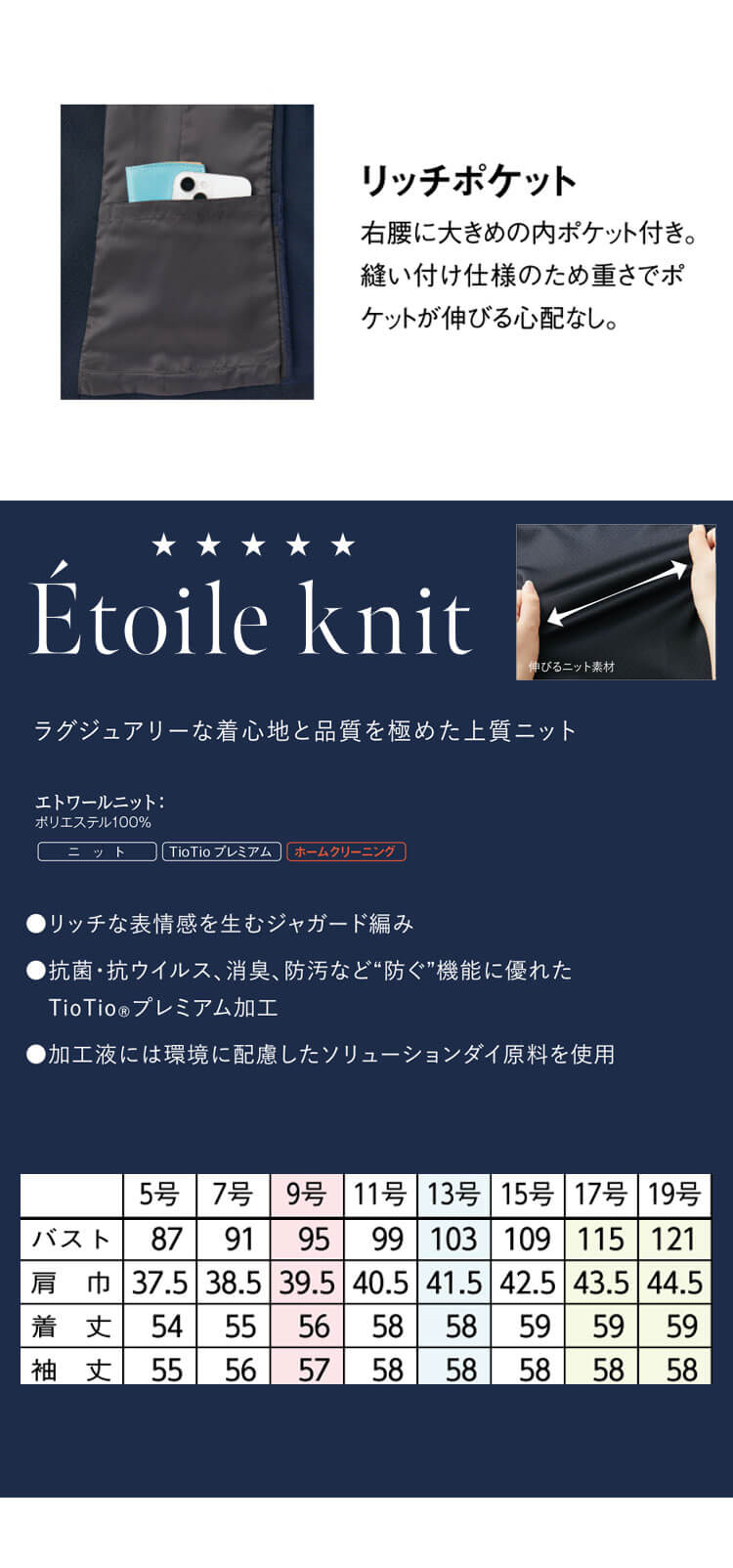 きちんと感がありながら、フロントファスナーデザインが程よくカジュアル感をプラスです。 カーディガン感覚でラフに羽織ったり、前を閉めて1枚でフォーマルに着こなすこともできます。上質を誇る、最高品質のニット「エトワールニット」シリーズです。立体感のあるジャガード編みが、ラグジュアリー感を際立たせ、リッチなムードが漂う着こなしです。ポリエステル糸は、染める際に水を50%以上カットするソリューションダイです。後加工には、“防ぐ”機能に優れたTioTioプレミアム加工です。空気中の酸素を利用して細菌の増殖を抑える抗菌・抗ウイルスや消臭に高い効果を発揮します。ついた汚れを落ちやすくする防汚機能もあり洗濯回数が減ることでエコにも繋がります。