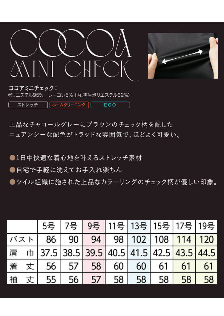 コンパクトなシルエットとプリンセスラインが大人かわいい2つ釦ジャケットです。挟み込みポケット仕様で、大容量なのも魅力です。ニュアンスカラーがやわらかな印象「ココアミニチェック」シリーズです。チャコールグレー×ブラウンの淡いチェック柄がどことなくフェミニンな印象です。大人トラッドスタイルは、幅広い職種や年齢層に愛されれるユニフォームの定番です。お求めやすい価格帯もポイントです。