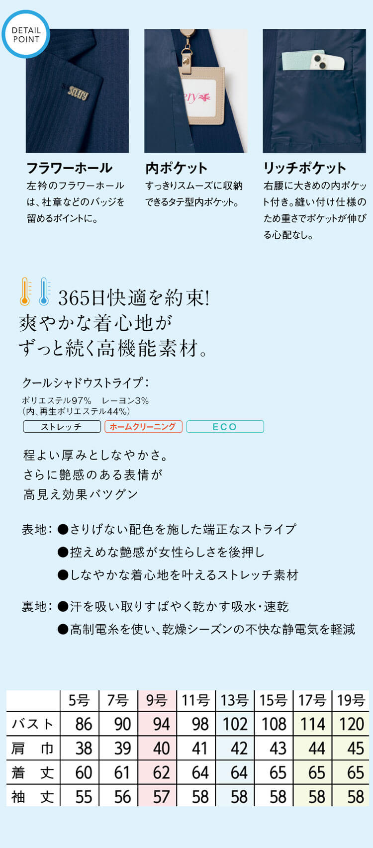 スッキリとしたタテ型シルエットのジャケットです。パンツにも相性の良い長めの着丈です。 一年中快適に働ける365日対応シリーズが登場しました。オールシーズン対応の「クールシャドーストライプ」は、程よい肉感としなやかさ、艶感のある表情が高見え間違いなしです。 吸水した汗を素早く拡散・速乾するので、一年中通して爽やかな着心地です。 高静電糸を使用している為乾燥シーズンの不快な静電気を抑制してくれます。