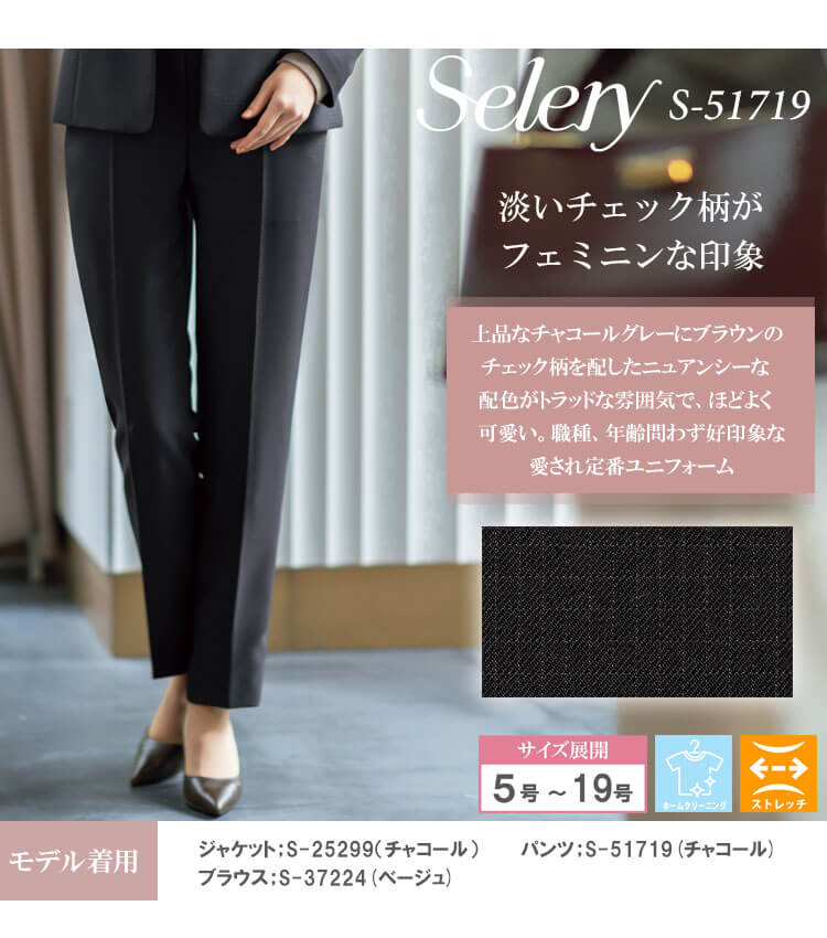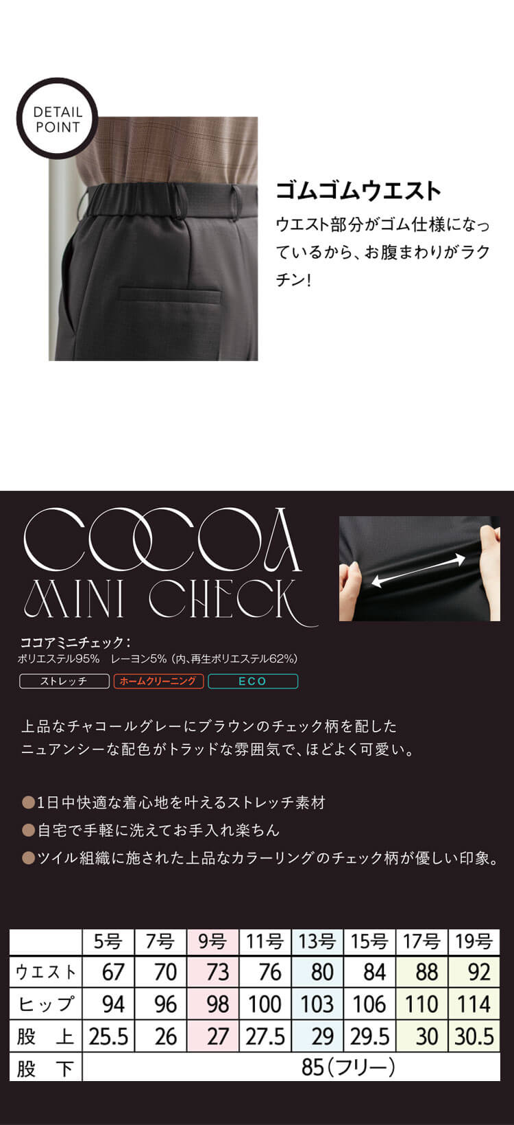 美脚の基本、テーパードシルエットです。動きやすさとスッキリさを両立するウエストゴム仕様です。ニュアンスカラーがやわらかな印象「ココアミニチェック」シリーズです。チャコールグレー×ブラウンの淡いチェック柄がどことなくフェミニンな印象です。大人トラッドスタイルは、幅広い職種や年齢層に愛されれるユニフォームの定番です。お求めやすい価格帯もポイントです。