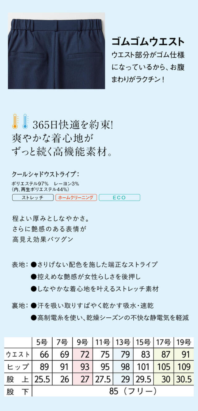 フロントにタックをとったストレートパンツです。適度なゆとりで動きやすく、美脚効果も抜群です。 ウエストは定番のゴム仕様です。着用時の圧迫感を軽減してくれる快適パンツです。一年中快適に働ける365日対応シリーズが登場しました。オールシーズン対応の「クールシャドーストライプ」は、程よい肉感としなやかさ、艶感のある表情が高見え間違いなしです。 吸水した汗を素早く拡散・速乾するので、一年中通して爽やかな着心地です。 高静電糸を使用している為乾燥シーズンの不快な静電気を抑制してくれます。