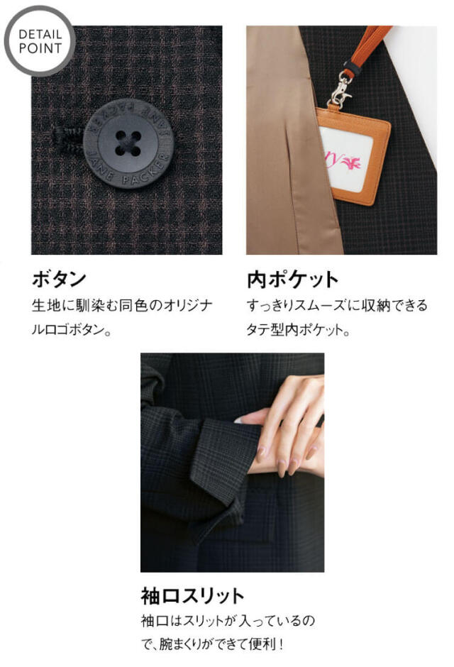 ダブルが今っぽいを演出してくれるノーカラージャケットです。パンツに相性良しの着丈感です。 暑い夏に気軽に羽織れる軽さと襟腰のきちんとさが着やすさ抜群です。リネンライクな肌触りに仕 上げた涼しげなサッカー調素材です。主張しすぎないチェック柄が上品さをプラスします。今までのユニフォームでは無かった概念への挑戦が可能に。JANE PACKER と、セロリーが出逢い、JANE PACKER の色味を統一したカラーテクニックや可憐なフラワーデザインを取り入れることで、洗練された印象へと導く大人スタイルが完成しました。今までのユニフォームには無かった概念へのさらなる挑戦が可能となり、セロリーのモノ作りへやスタイリングを、さらに進化させます。ONE TONE で描かれる洗練された色の世界観。デスクにいる時だけが仕事じゃない今の時代に働く服こそ “自分らしい” カラーとデザインを選ぶ、そんな女性に。