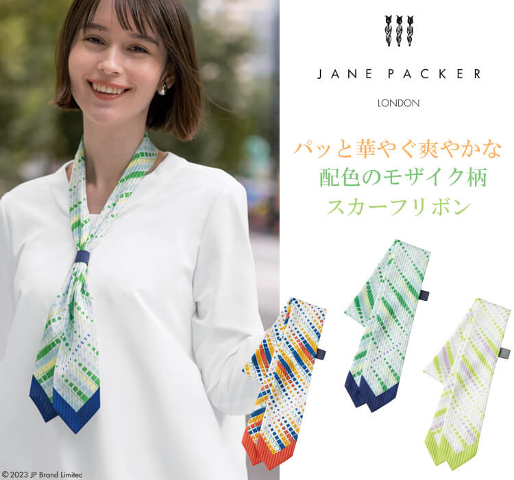 パッと華やぐ爽やかな配色のモザイク柄スカーフリボンです。今までのユニフォームでは無かった概念への挑戦が可能に。JANE PACKER と、セロリーが出逢い、JANE PACKER の色味を統一したカラーテクニックや可憐なフラワーデザインを取り入れることで、洗練された印象へと導く大人スタイルが完成しました。今までのユニフォームには無かった概念へのさらなる挑戦が可能となり、セロリーのモノ作りへやスタイリングを、さらに進化させます。ONE TONE で描かれる洗練された色の世界観。デスクにいる時だけが仕事じゃない今の時代に働く服こそ “自分らしい” カラーとデザインを選ぶ、そんな女性に。