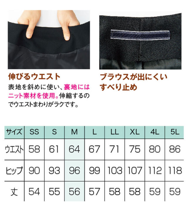 ラク伸びウエストのボトムスが登場しました。ウエスト部分の表地を斜めに使い、裏地はニット素材を使用することで快適フィット。ニット裏地はすべりにくく、ブラウスのズリ上がりを防ぎます。さらに約1.5cm幅でバネが伸縮する「ラクラクカン」仕様により、座ってもかがんでもお腹まわりがラクラクです