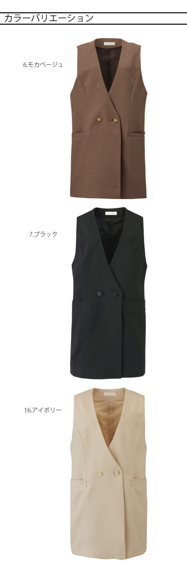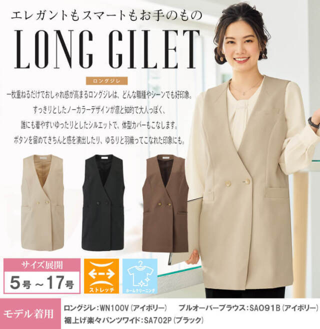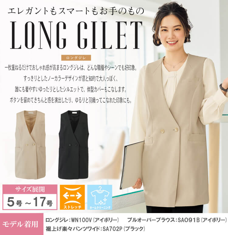 一枚重ねるだけでおしゃれ感が高まるロングジレは、どんな職種やシーンでも好印象。すっきりとしたノーカラーデザインが凛と知的で大人っぽく、誰にでも着やすいゆったりとしたシルエットで、体型カバーもこなします。ボタンを留めてきちんと感を出したり、ゆるりと羽織ってこなれた印象にも。