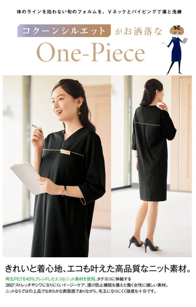 すとんとらくに着られて体型カバー効果抜群です。爽やかさやクリーンさが必要なクリニックや華やぎがほしい美容系の職場に最適です。品格をまとえるワンピースは高級感の漂うホテルやディーラーでも好感度を発揮します。まろやかなシルエットがきれいなワンピースはシンプルだからこそ小物次第で印象自在です。ベストな位置が分かるスカーフクリップ用ホール付きで付ける位置に迷わずコーデを楽しめます。再生petを40%ブレンドしたエコなニット素材を使用しました。タテヨコに伸縮する360°スレッチやシワになりにくいイージーケア、透け防止機能も備えた働く女性に嬉しい素材です。ニットならではの上品でなめらかな表面感でありながら毛玉になりにくく強度も十分です。