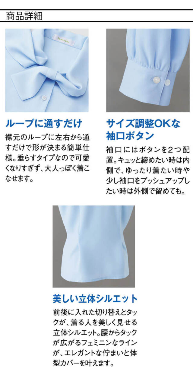 一枚でもジャケットやベストを重ねてもおしゃれ感たっぷり。着回しが楽しいブラウス&トップスです。シワになりにくく、しなやかなドレープ感と肌ざわりの良い着心地が魅力の上質素材です。ループに通すだけで簡単きれい!爽やかカラーの上品なボウタイブラウスが新登場。