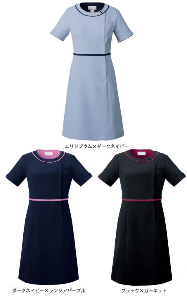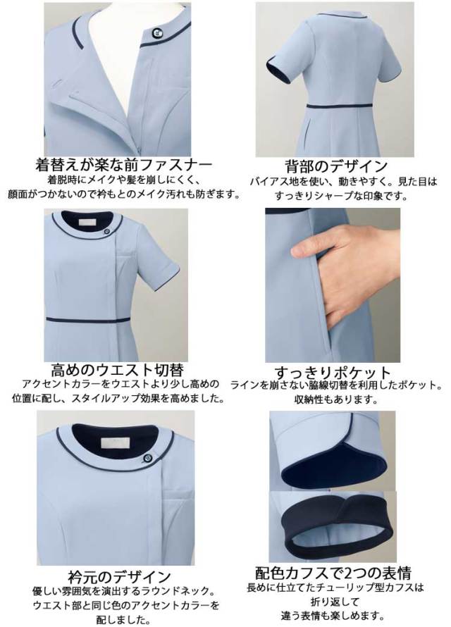 エレガントな丸いネックラインも上品さを演出してくれるワンピース。 柔らかな風合いと優れた吸水性と拡散性、ドライ感じを実現させた新開発のスクラブ生地で作ったワンピースです。 スマートでどこかクラシカルなデザインながら着心地を考慮したコンフォートスタイル。(デンタルや審美歯科やエステなどにもおすすめのデザインです) リップやハンカチなどの小物収納にも便利な両脇ポケットや胸ポケットには名札を付けられる二重構造など機能面も充実。
