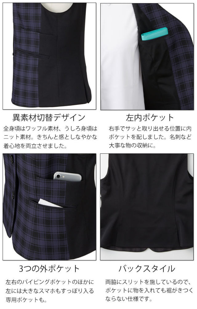 幅広い体型にフィットするよう設計されたチェック柄事務服ベスト。前身頃はきちんと感のある素材ですが、後身頃に伸びるニット素材を使用したことで、優れたストレッチ性を実現。さらに後ろ裾に2ヶ所スリットが入ることで、さまざまな体型の方、食事後の体型変化など、ストレスなく快適に着やすいデザインのベストになっています。スマートフォンポケットや内ポケットなどちょっとした収納に便利なポケットが複数ついているので安心。シンプルなデザインと高機能性で、幅広い年代や職種の方に着用していただける事務服ベストです。