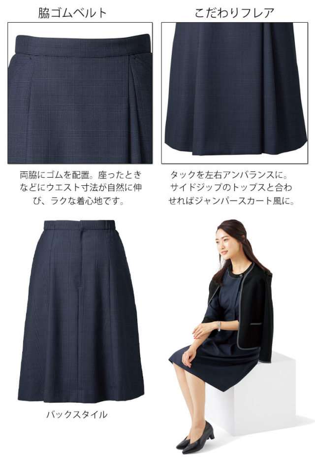 アシンメトリーなフレアーのデザインが特徴のスカート。裾に広がるフレアーのフェミニンさで可愛さを出しつつ、トラッドなチェック柄で甘くなりすぎない大人な印象を与えているので、幅広い年齢層の方に着用いただけます。。脇ゴム仕様のスカートなので、お腹周りの圧迫を軽減し、長時間座っていてもきつくなることがなく、食事後でも安心。同素材のFV36380をはじめ、無地ベースのトップスと合わせてジャンパースカート風に着こなしができるのも魅力的なスカートです。無料カタログ、無料貸出しサンプルも対応。大量注文のお値引きもご相談ください。事務服・オフィス制服の激安全国通販サイト【事務服ショップ】無料カタログ、無料貸出しサンプルも対応。大量注文のお値引きもご相談ください。事務服・オフィス制服の激安全国通販サイト【事務服ショップ】。