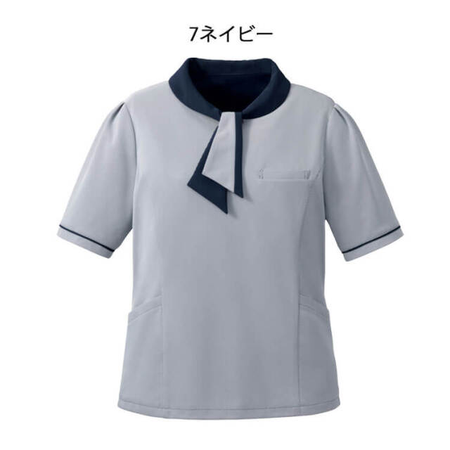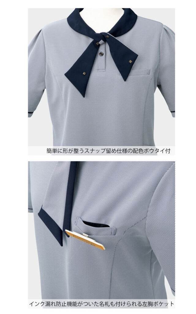 配色のボウタイデザインが大人可愛い印象のニットポロシャツです。ボウタイにはスナップボタンがついており、誰が結んでも簡単に同じ形にできる仕様になっています。また、配色と少し光沢感のある生地を使用した襟元は、小顔効果を演出します。ネイビーの配色がアクセントの袖元は、女性に嬉しい二の腕をカバーする長めの袖丈です。着丈は同素材のポロシャツ(FB71412)よりも短くしたことで、主にスカートとのコーディネートをおすすめします。幅広い年代や体型の方に着用いただけるオールシーズン快適なニットポロシャツです。