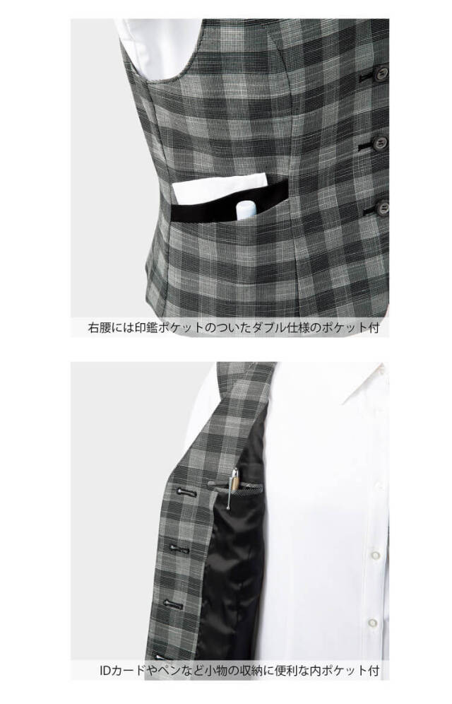 シックに着映えするモノトーンのチェック柄ベストです。スラブヤーンという凹凸のある糸を使用したシンプルなブラック&ホワイトのブロックチェックです。スラブヤーンを使用することで、サラッとした印象でオールシーズン着用できます。バックのウエスト部分と腰ポケット玉縁にヘリンボーンストレッチの配色別布を使用することで、全体的に引き締まった印象になります。汗ばむ季節も快適な肌ざわりのチェック柄ベストです。