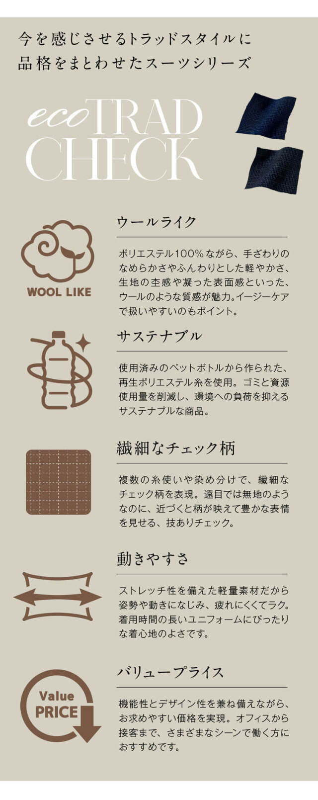クラシックとトレンドが調和する、エコトラッドチェックジャケットです。今を感じさせるトラッドスタイルに品格をまとわせたスーツシリーズです。素材、デザイン、機能のすべてが、オフィスからフォーマルなシーンまで対応できるクオリティーです。しかも、サステナブルな面も配慮した『エコトラッドチェック』です。クラシックとトレンドが調和する見た目と着心地のよさで、着る人には華やぎを、接する人には好印象を与える、洗練されたスーツシリーズです。機能性とデザイン性を兼ね備えながら、 お求めやすい価格を実現しました。オフィスから接客まで、さまざまなシーンで働く方におすすめです。ポリエステル100% ながら、手ざわりのなめらかさやふんわりとした軽やかさ、生地の杢感や凝った表面感といった、ウールのような質感が魅力です。イージーケアで扱いやすいのもポイントです。
