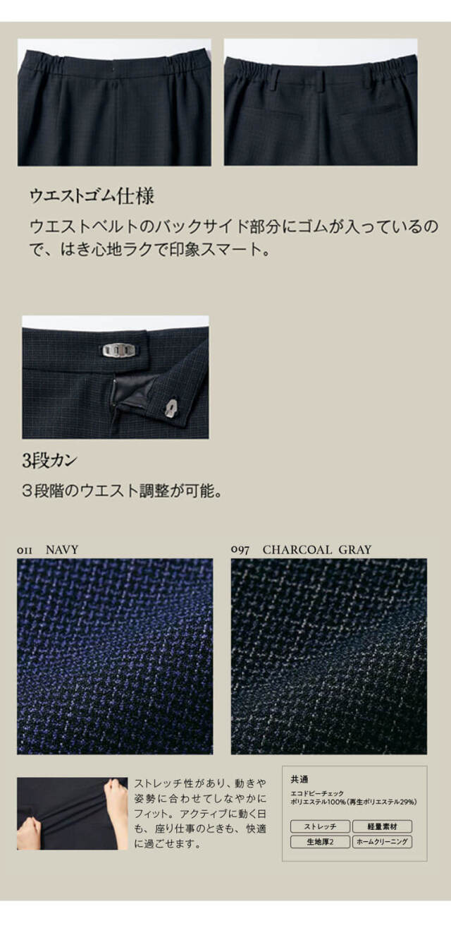 クラシックとトレンドが調和する、エコトラッドチェックAラインスカートです。今を感じさせるトラッドスタイルに品格をまとわせたスーツシリーズです。素材、デザイン、機能のすべてが、オフィスからフォーマルなシーンまで対応できるクオリティーです。しかも、サステナブルな面も配慮した『エコトラッドチェック』です。クラシックとトレンドが調和する見た目と着心地のよさで、着る人には華やぎを、接する人には好印象を与える、洗練されたスーツシリーズです。機能性とデザイン性を兼ね備えながら、 お求めやすい価格を実現しました。オフィスから接客まで、さまざまなシーンで働く方におすすめです。ポリエステル100% ながら、手ざわりのなめらかさやふんわりとした軽やかさ、生地の杢感や凝った表面感といった、ウールのような質感が魅力です。イージーケアで扱いやすいのもポイントです。