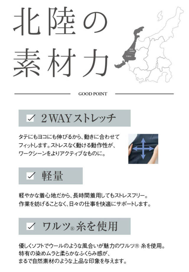 北陸産生地を使って実現した高品質&低価格の2WAYストレッチスーツです。加賀絹で知られる「石川県の織り」と日本屈指の染色加工技術を有する「福井県の染め」、2つの融合によって生まれた素材は2wayストレッチと軽い着心地が快適で、自然素材のような繊細でやさしい風合いが特長です。そんな上質素材を、どんなシーンにも相応しい、美しくシンプルなスーツに仕立てました。その上、高品質なのに低価格です。上品な華やぎと好印象を映す穏やかな色調のネイビーと端正な美しさと品格を授ける深く華やかなブラック、ニュアンスのある繊細な杢調が洗練感に差をつけるブルーグレーの3色展開です。
