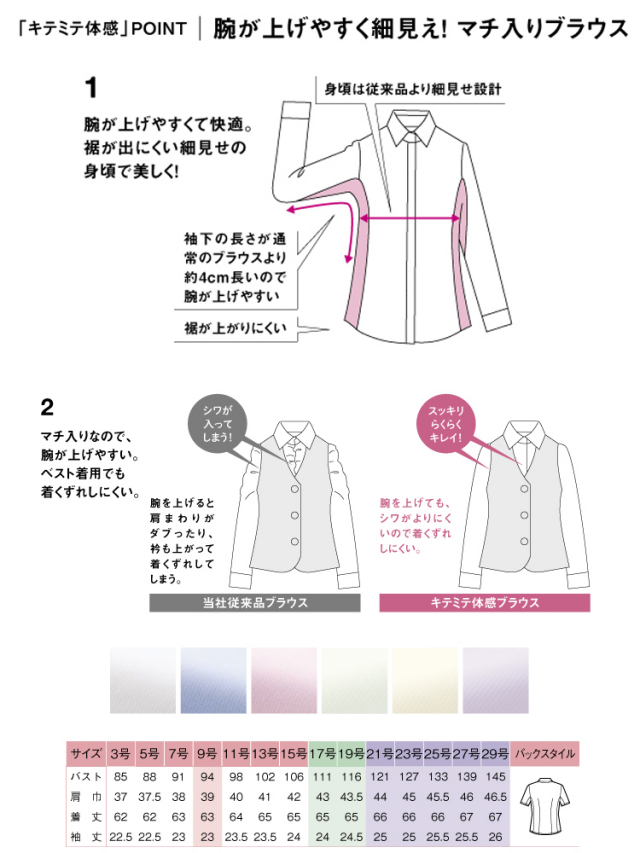 東レスプリンジー生地使用。速乾性は綿の約7倍以上!だから汗をかいても着心地さらっと。お洗濯時の乾きもスピーディーです。セラミックで練りこんだ特殊ポリマーの働きで、気になる透けを防止。UVカット効果も発揮します。また、合わせの隙間かた中が見えないように、各ブラウスにデリケートボタンをつけました。