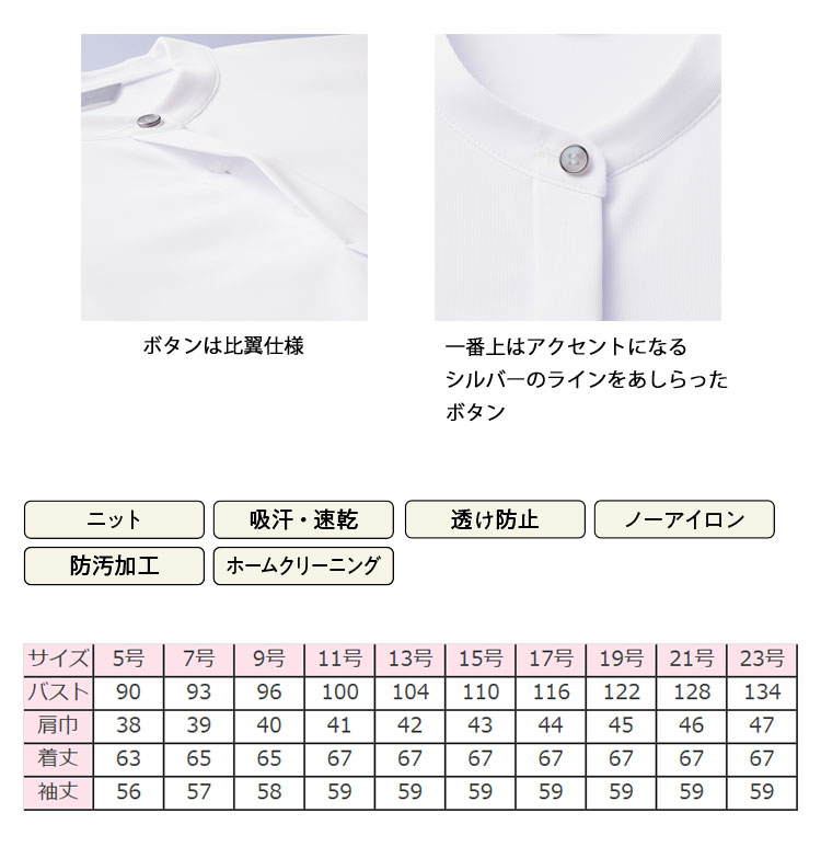 アイロン不要できちんと美しい、高い形態安定性を持ちながら肌触りは柔らかく滑らかで、緻密な編み目が上質な雰囲気を出します。高機能でありながら、美しさや着心地も犠牲にしない。そんな高い素材力は、国内有数の繊維産業地、福井県で培われた技術があるからこそ。洗濯しても生地の張り感やシルエットが崩れにくく、ほどよい伸縮性や、吸水速乾仕様など、とことん便利に心地よく。北陸産こだわり素材のブラウスなら、毎日がより快適に変わります。一枚でもレイヤードとしても着回しやすく、キラリと輝く襟元のボタンがアクセントになります。