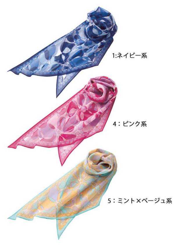 ロングタイプのシフォンスカーフは、装いに合わせてアレンジが自在です。エレガントなフラワープリントが、フェイスまわりを華やかに演出します。