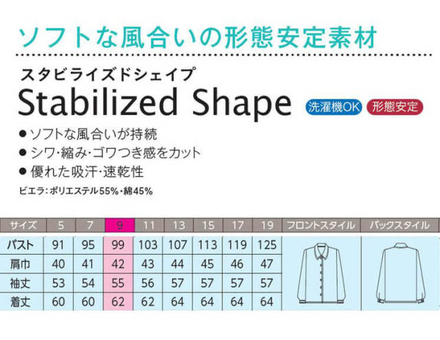 ソフトな風合いが持続のシワや縮みやゴワつき感をカットする形態安定素材のブラウスです。