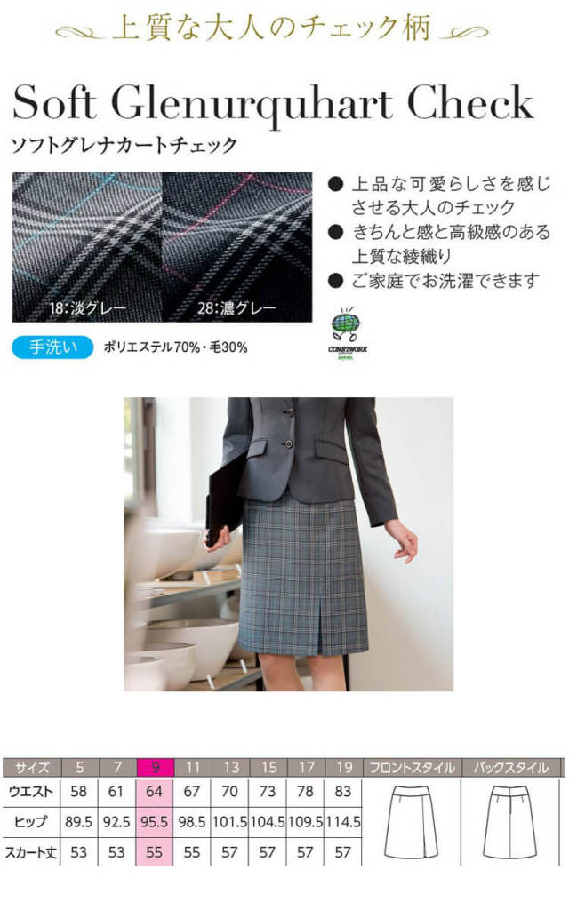 チェック柄とグレーの組み合わせが誠実な印象を与えます。事務服などのオフィスユニフォ―ムはもちろん、受付などのおもてなし業の制服としてなど幅広い職種にお勧めです。。事務服などのオフィスユニフォ―ムはもちろん、受付などのおもてなし業の制服としてなど幅広い職種にお勧めです。