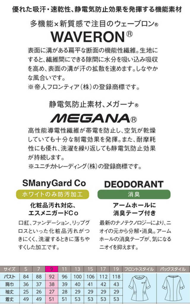 接客する人も魅了することの2つの色を、ビューティーシーンのコミュニケーションカラーにすれば、お客様とスタッフとの心の距離がグッと近づきます。防汚加工で白でも安心な上質感のあるストレッチ素材です。吸汗・速乾性があり快適な着心地です。優れた制電性で不快な静電気を防止します。受付、おもてなし、美容関係、クリニック、ケアホームなどさまざまな職業に合ったシリーズです。