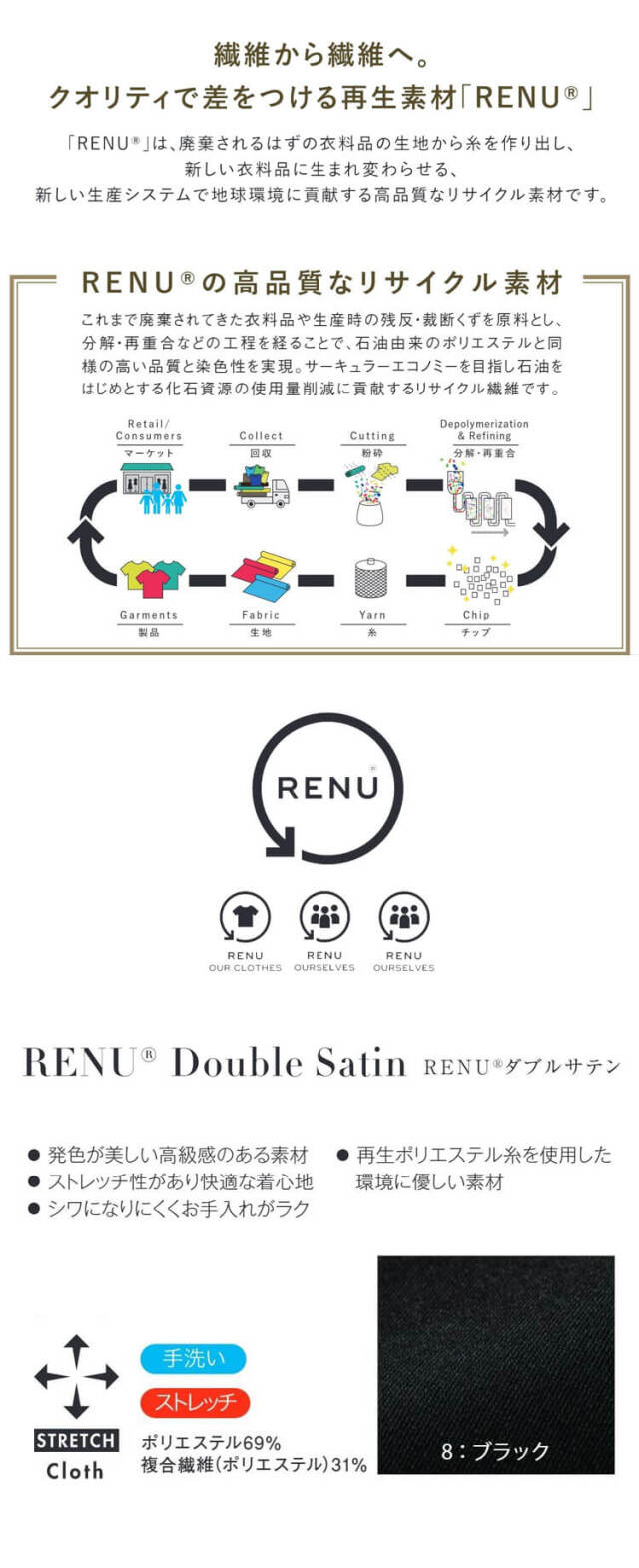 深みのある漆黒のRENUダブルサテン素材を使った、知的でクールな印象のノーカラージャケットです。 襟元をすっきり見せるノーカラーデザインと裏地付き仕様により、女性らしいしなやかさと信頼感のあるスタイルを演出し、受付や接遇などフォーマルなオフィスシーンに最適です。 程よいゆとり感があり、きちんと感とさりげないトレンド感を両立させた上品なスタイルに仕上がっています。RENUダブルサテンは発色が美しく高級感のあるサステナブル素材で、再生ポリエステル糸を使用した環境配慮型の生地です。 ストレッチ性がありシワになりにくく、長時間の着用でも快適で、お手入れも比較的簡単な点が特徴です。