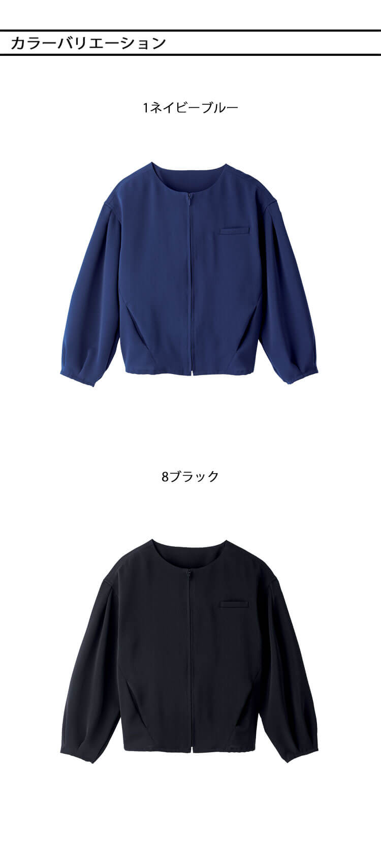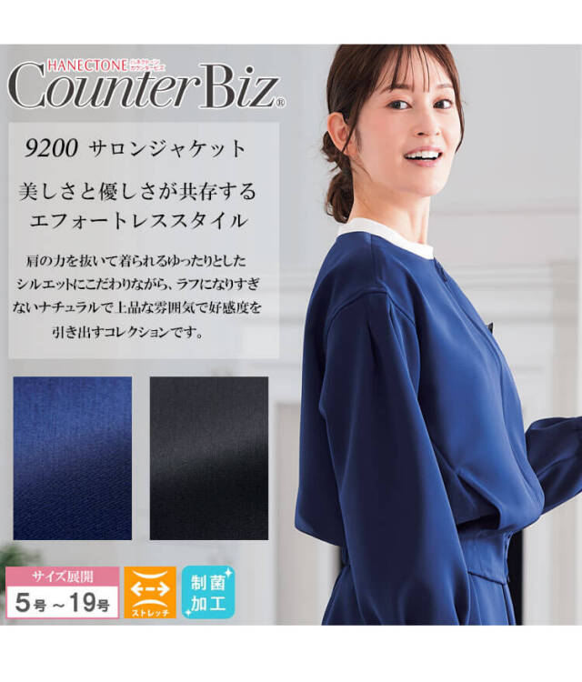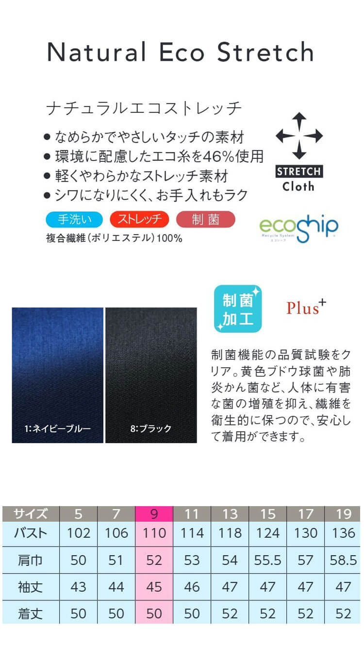 上品な光沢とやわらかなストレッチ性が魅力のジャケットです。軽くてしなやかな「ナチュラルエコストレッチ」素材を使用し、長時間の着用でもストレスを感じにくい快適な着心地です。 ポリエステル系複合繊維100%のエコ素材で、制菌加工が施されているため、清潔感を保ちたい受付・サロン・クリニックなどのシーンにおすすめです程よく丸みのあるシルエットが女性らしいラインをきれいに見せ、上品で洗練された印象を演出します。 左胸ポケット、両腰ポケットに加え、両腰内ポケットや名札ループ、後ろウエストゴム仕様など、現場で使いやすい機能をしっかり備えています。自然な伸縮性のあるストレッチ素材で動きやすく、立ち座りや腕の上げ下ろしが多い接客業務にもぴったりです。 シワになりにくく手洗い可能なため、日々のお手入れも簡単で、オールシーズン快適に着用できます。同素材のワンピース(7750)やワイドパンツ(9864)とセットアップすれば、統一感のあるおもてなしスタイルが完成します。 ネイビーブルーとブラックの2色展開で、落ち着いたカラーがどんな職場のイメージにも合わせやすい一枚です。