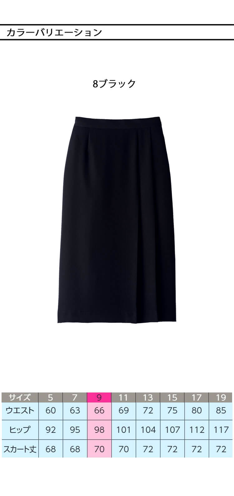 ・左前脇プリーツスカート丈70cm(9号)
