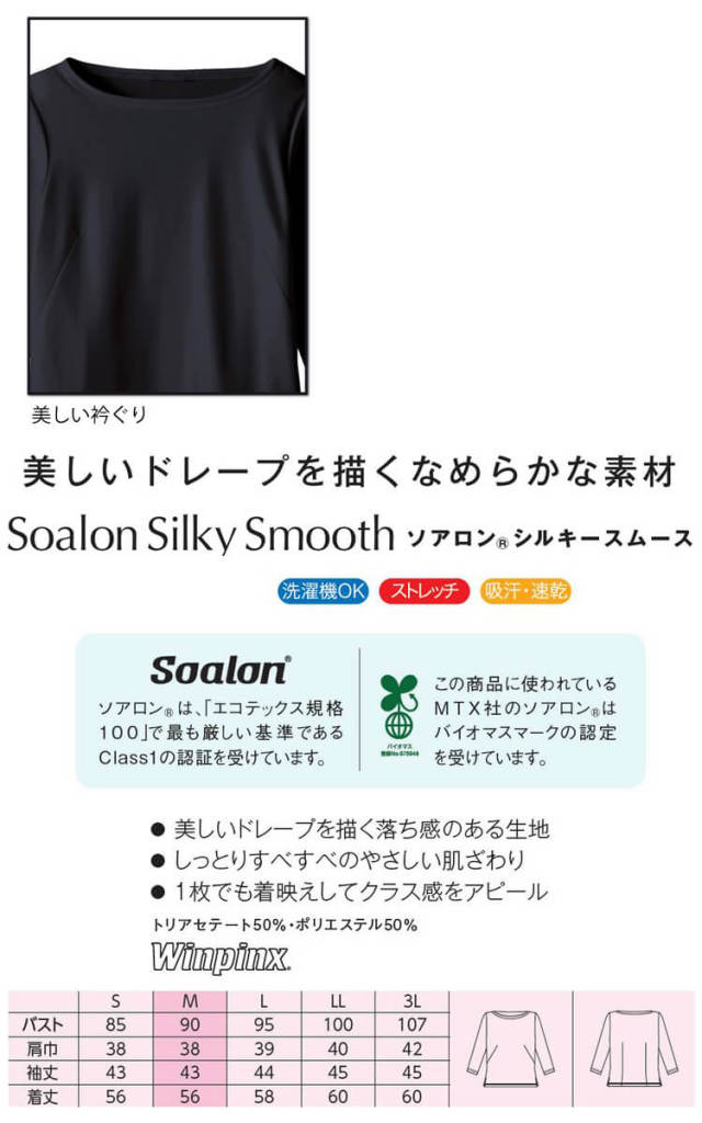 おもてなしカットソー。美しいドレープを描くなめらかな素材です。しっとりすべすべのやさしい肌触りです。1枚でも着映えしてクラス感をアピール。吸汗速乾性に優れ、着心地よく快適です。ウエストインでもアウトでもきちんと決まります。事務服などのオフィスユニフォ―ムはもちろん、受付などのおもてなし業、医療関係の制服としてなど幅広い職種にお勧めです。