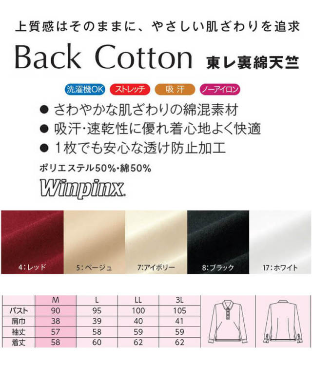 おもてなしカットソー。上質感はそのままに、やさしい肌触りを追求しました。さわやかな肌触りの綿混素材です。吸汗速乾性に優れ着心地良く快適です。1枚でも安心な透け防止加工す。ウエストインでもアウトでもきちんと決まります。事務服などのオフィスユニフォ―ムはもちろん、受付などのおもてなし業、医療関係の制服としてなど幅広い職種にお勧めです。