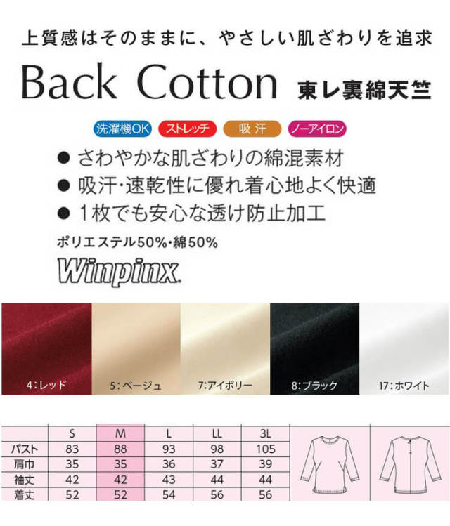 おもてなしカットソー。上質感はそのままに、やさしい肌触りを追求しました。さわやかな肌触りの綿混素材です。吸汗速乾性に優れ着心地良く快適です。1枚でも安心な透け防止加工す。ウエストインでもアウトでもきちんと決まります。事務服などのオフィスユニフォ―ムはもちろん、受付などのおもてなし業、医療関係の制服としてなど幅広い職種にお勧めです。