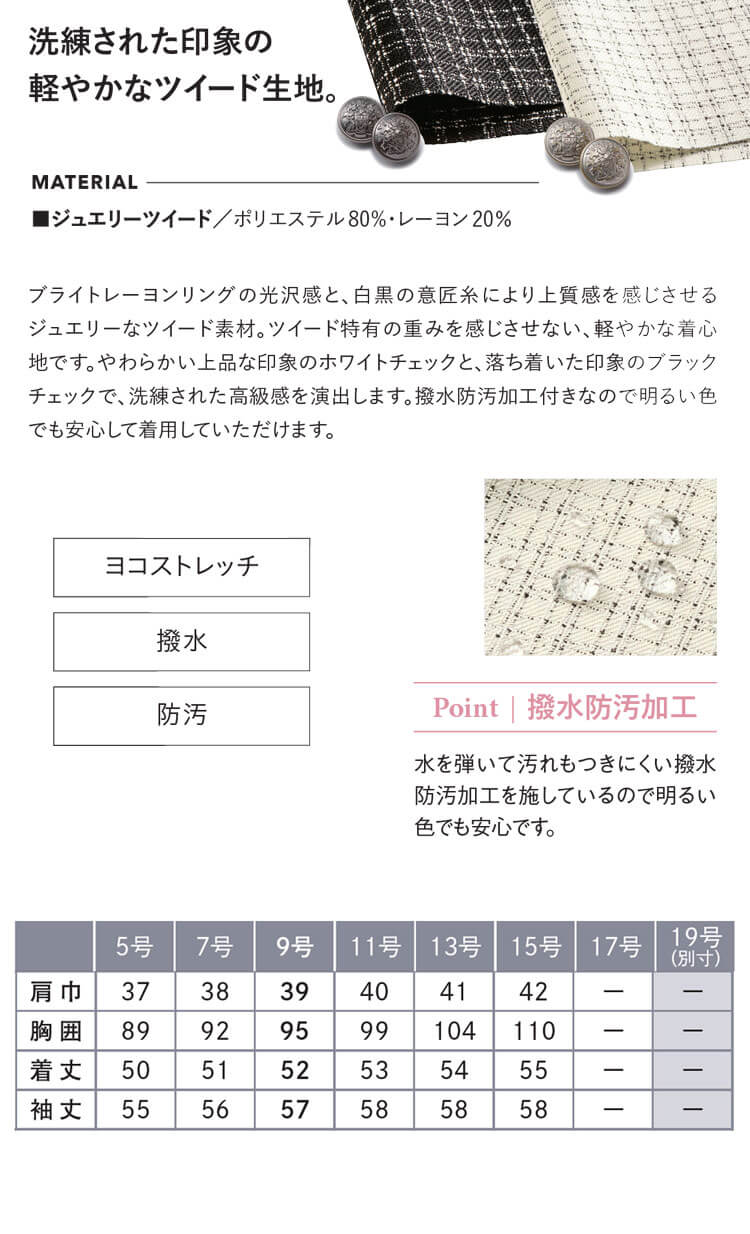 ウェルビーイングに、私らしく輝く毎日を、ファッショントレンドのツイード生地をユニフォームにしました。女性らしいデザイン、高級感もある金属ボタンで印象がワンランクアップします。デザイン面だけでなく、白でも汚れにくい撥水・防汚加工をほどこしたり、多機能ポケットなど、機能面にもこだわりました。パンツにもスカートにも合わせやすいデザインで、今よりも半歩先を行くニューオフィススタイルです。肩パットなしの軽い仕立てで着心地上々のジャケットです。素材には洗練された印象の軽やかなツイード生地を使用しました。ブライトレーヨンリングの光沢感と、白黒の意匠糸により高級感を感じさせるジュエリーなツイード素材です。ツイード特有の重みを感じさせない快適な着心地です。やわらかい上品な印象のホワイトチェックと、落ち着いた大人っぽい印象のブラックチェックで、洗練された高級感を演出します。撥水防汚加工付きなので明るい色でも安心して着用して頂けます。