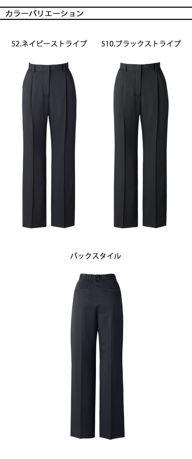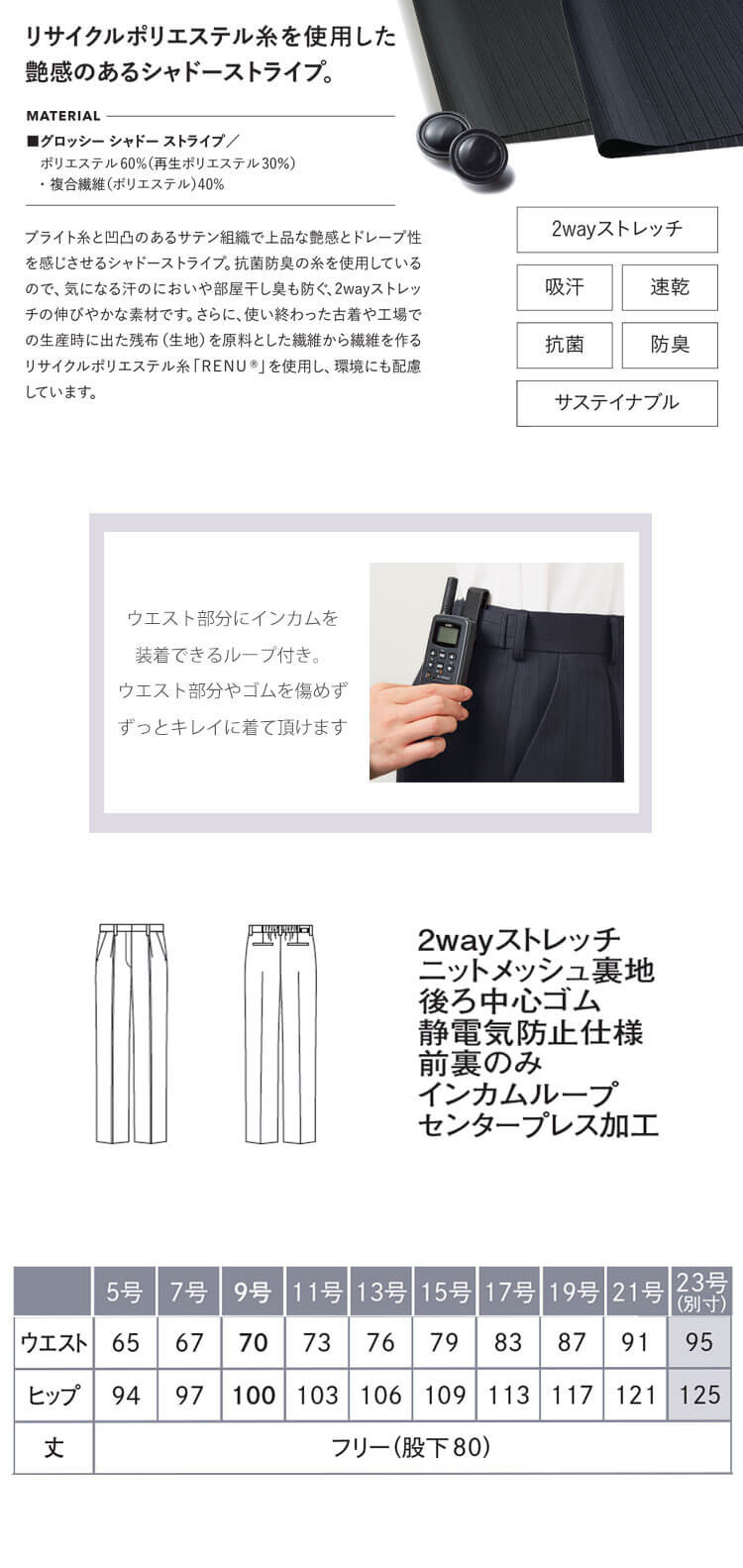 シャープな艶やかさを秘めた服です。艶感のあるシャドーストライプ生地、女性らしさを引き立てるシルエットに、大人の女性の格好良さをプラスしました。抗菌防臭、インカムをすっきり収納できるループなど、機能面にもこだわった「Glossy Flora」です。鮮度の高いラグジュアリーな印象のシリーズです。ブライト糸と凹凸のあるサテン組織で女性らしい艶感とドレープ性を感じさせるシャドーストライプの生地を使用したストレートパンツです。抗菌防臭の糸を使用しているので、気になる汗のにおいや部屋干し臭も防ぐ、2WAYストレッチの快適で伸びやかな着心地の素材です。さらに、使い終わった古着や工場での生産時に出た残布(生地)を原料とした繊維から繊維を作るリサイクルポリエステル糸「RENU」を使用しているので環境にも配慮しています。