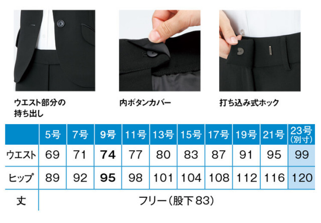 ほっそりくびれたウエスト、キュット上がったヒップ、伸びやかで快適な着心地をかなえながらもこだわりの立体パターンで「1サイズスマート効果」を実現。堂々と自信を持って、おもてなしのシーンを美しく演出できます。静電気を防ぐ放電テープが触れた瞬間にパチッとくる不快感を抑えるので、間近で接客するときも安心です。